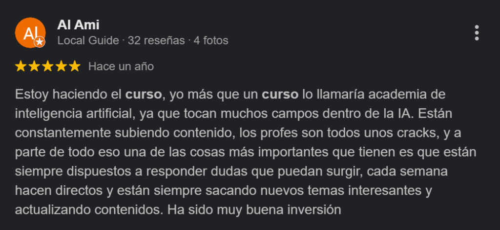 “Más que un curso, es una academia de inteligencia artificial completa. Tocan muchos campos, los profes son cracks, y siempre están actualizando contenidos y resolviendo dudas. Ha sido una inversión excelente.”