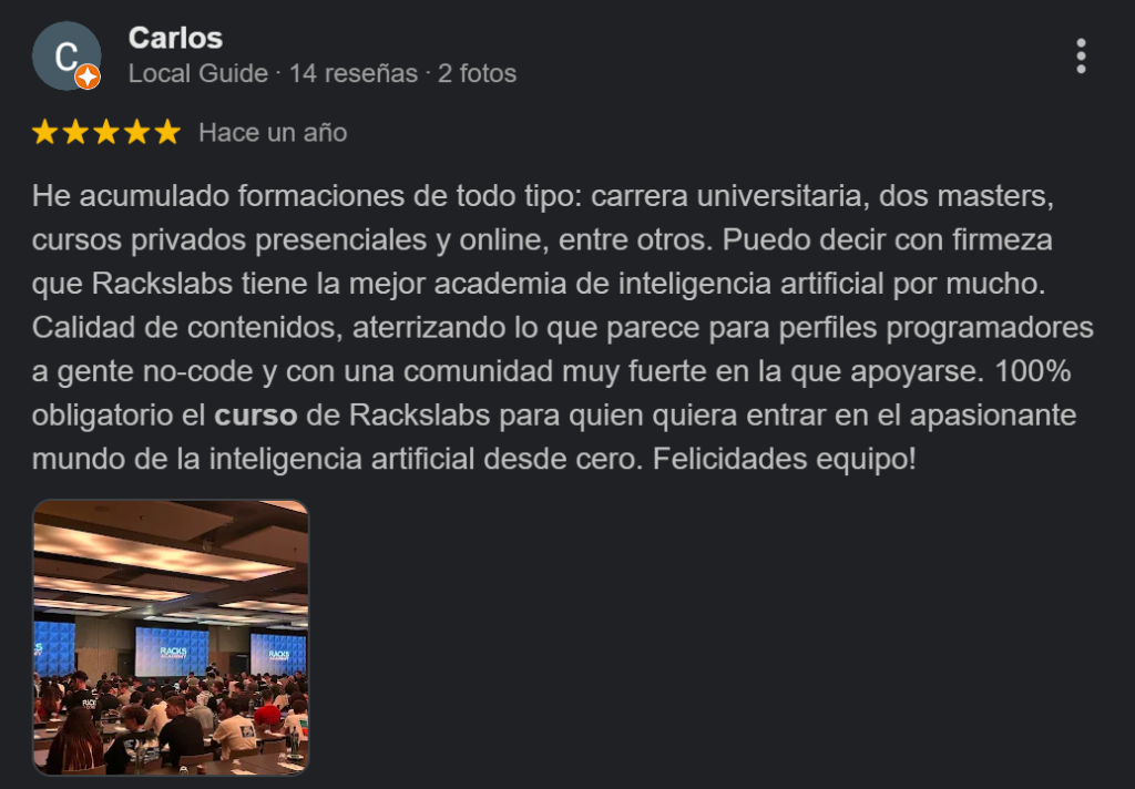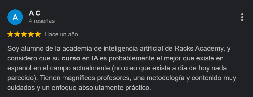 “He hecho de todo: universidad, másteres, cursos privados… y puedo decir con firmeza que Racks Academy es la mejor formación en inteligencia artificial en español. Contenidos de calidad, comunidad brutal y enfoque práctico. 100 % recomendable.”